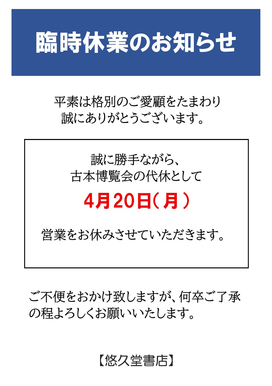 by 悠久堂書店初めての全ニッポン古本博覧会でしたが天候にも恵まれ本当にたくさんのお客様にご来場いただきました。ありがとうございます。紙の本の良さをみんなで分かちたいという古本屋、新刊書店、出版社の思いが皆さまに伝わっていたら嬉しいです。明日は代休とさせていただきますが、明後日からは通常通り営業いたします。また来たいを思える「本の街神保町」を続けて行くためにも是非 …