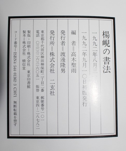 本の紹介 Published on 2018年6月27日 二玄社『楊峴の書法』2018/06/27 written by 悠久堂書店 二玄社発行の『楊峴の書法』 高木聖雨へ編集で1992年に刊行されたが 隷書だけでなく行草作品や尺牘も多数掲載されている ほかに類書がないので楊峴を勉強される方にはお勧めです 関連ページ