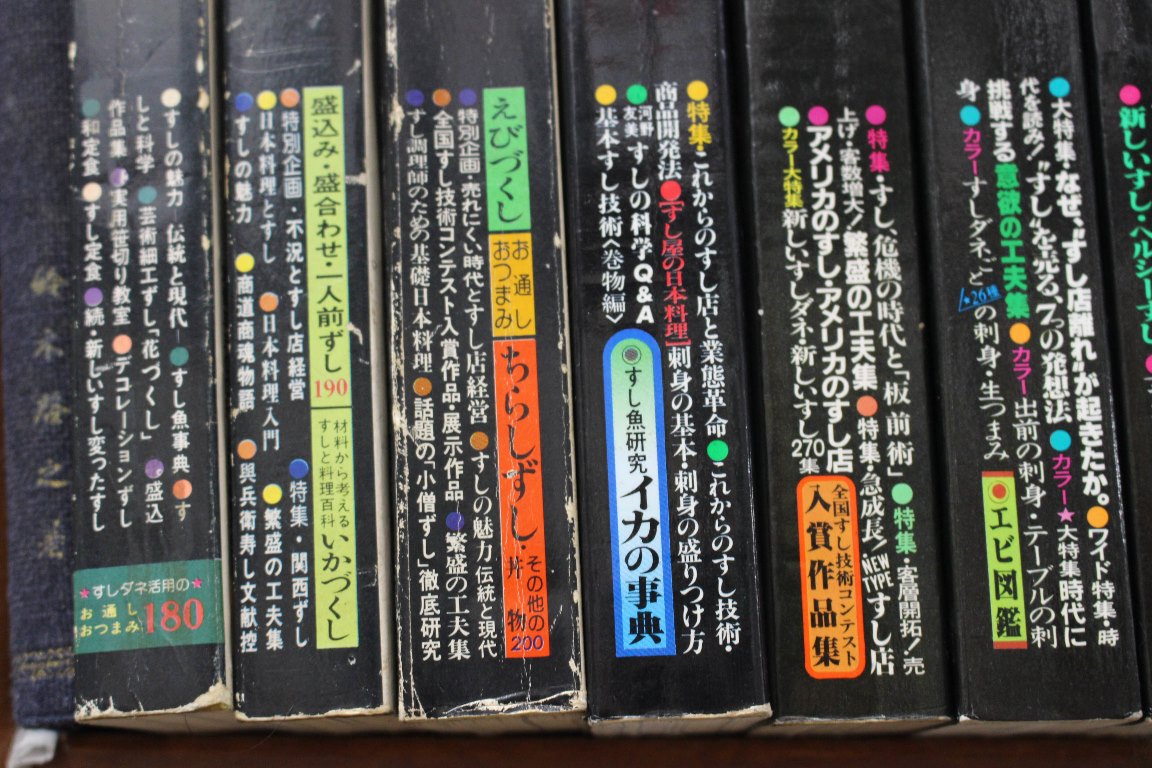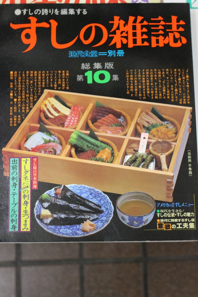 本の紹介 Published on 2016年6月22日 『すしの雑誌』旭屋出版 written by 悠久堂書店 蒸し暑くて食欲のない時にふと酢飯が食べたくなったりしませんか? そんな時に見るだけでテンションが上がる『すしの雑誌』をおススメします 旭屋出版の『近代食堂』の別冊としてすしの専門家のために発行された雑誌ですが どこか週刊誌の見出しを思わせる背表紙やエビとイカの記事が妙に多かったり いろいろ興味をそそられます。 すしの雑誌 関連ページ