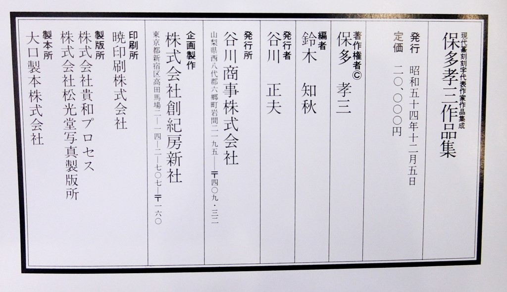 本の紹介 Published on 2018年4月20日 『保多孝三作品集』谷川商事株式会社 2018/04/20 written by 悠久堂書店 現代篆刻刻字代表作家作品集成から「保多孝三作品集」をご紹介します 大正から昭和にかけて活躍した篆刻家 保多孝三の書、篆刻、刻字以外にも スケッチや絵なども掲載されていてその多彩ぶりがうかがわれる1冊です 関連ページ