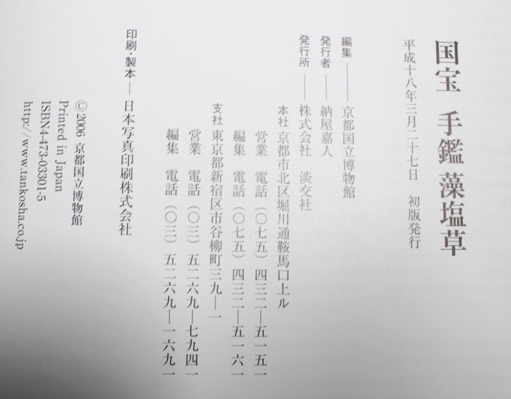 本の紹介 Published on 2017年11月10日 『国宝 手鑑藻塩草』京都国立博物館 2017/11/10 written by 悠久堂書店 かなの名品の宝庫、手鑑藻塩草 本物は京都国立博物館に所蔵されていますが この本を見ればすべて一度に見ることが出来ます さらに嬉しいことに釈文と解説、索引もついていて鑑賞にも勉強にも役立ちます 『国宝 手鑑藻塩草』淡交社 2006年発行 関連ページ