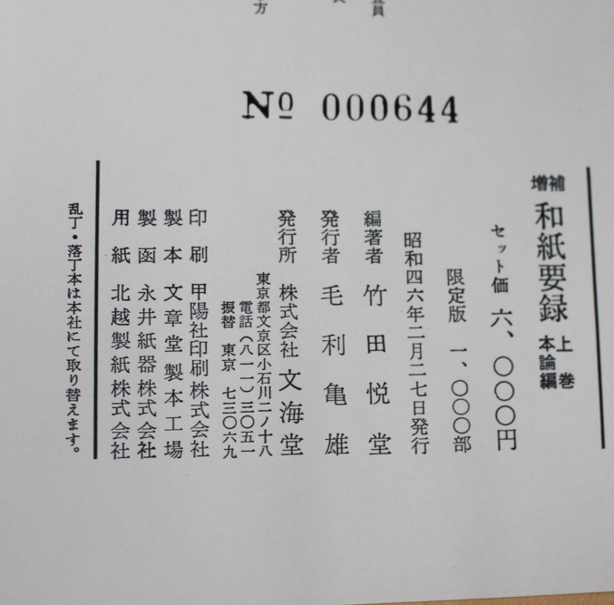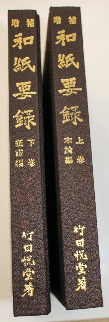 本の紹介 Published on 2018年2月21日 『増補 和紙要録』竹田悦堂著 2018/02/21 written by 悠久堂書店 2014年に日本の手漉き和紙技術が無形文化遺産に登録されたことは記憶に新しいですが 日本にはどれくらいの種類の和紙が存在する(していた)か、ご存知ですか? この本では歴史から生産地、原料、紙の作り方まで詳しく書かれています。 本論編と紙譜編の上下2冊で持ち運びもしやすい小さめのサイズです。 紙のサンプルが付いている本にしては値ごろなのでおススメです。 『増補 和紙要録』文海堂 限定1000部 昭和46年 1函2冊 竹田悦堂著 関連ページ