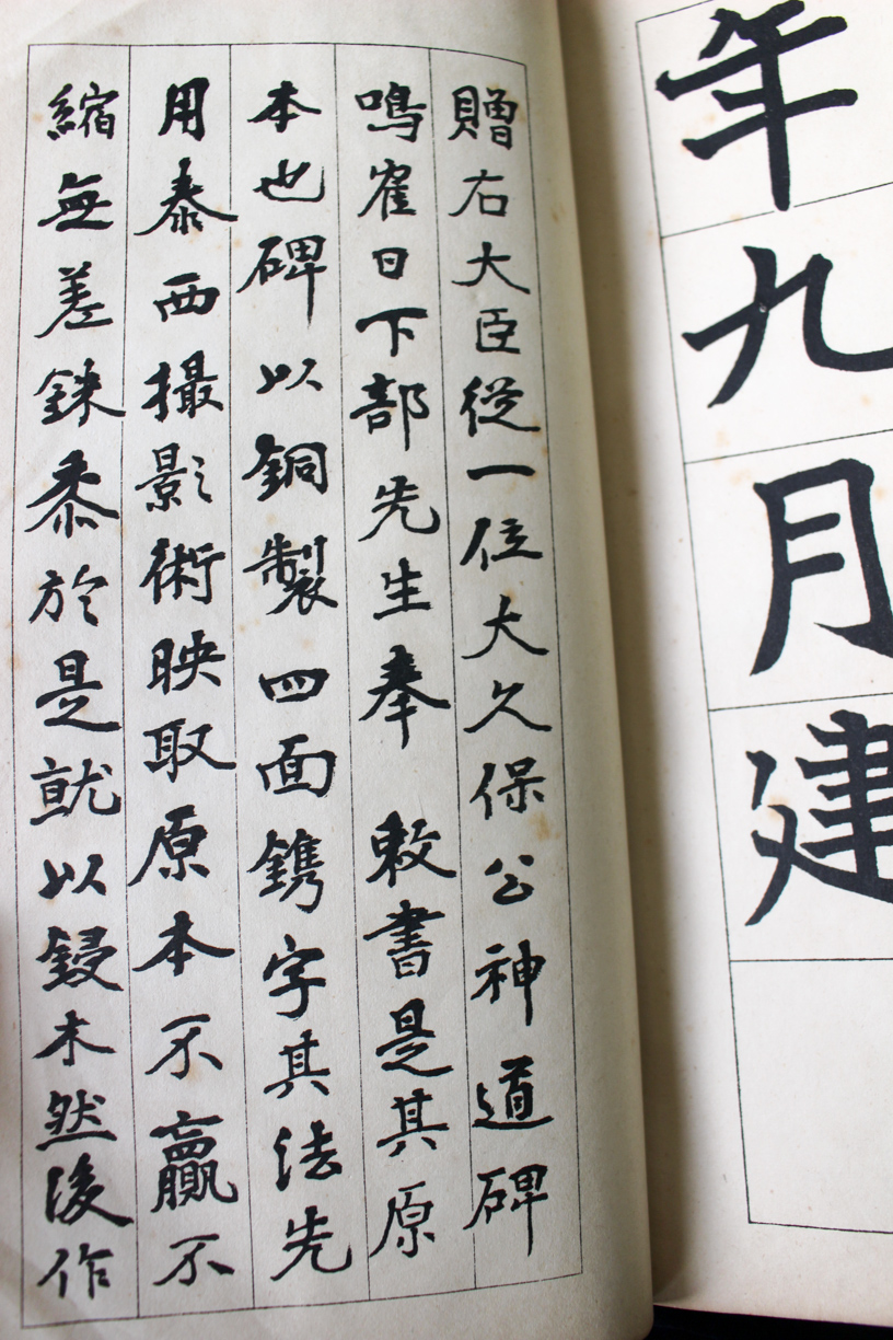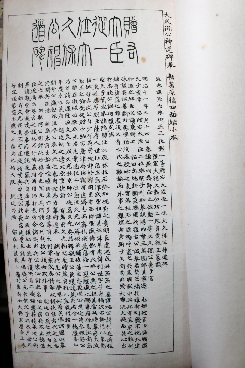 本の紹介 Published on 2018年5月25日 『大久保公神道碑奉 勅書原本写真精印 』元亨利貞4冊 2018/05/25 written by 悠久堂書店 日下部鳴鶴の超大作「大久保公神道碑奉」全4冊 大久保利通公の碑は青山霊園で見ることができる 各字の大きさ約5.5センチ 総字数2919字 碑のサイズは310センチ×143センチ×98センチ 『大久保公神道碑奉 勅書原本写真精印 』元亨利貞 全4冊 西東書房 関連ページ