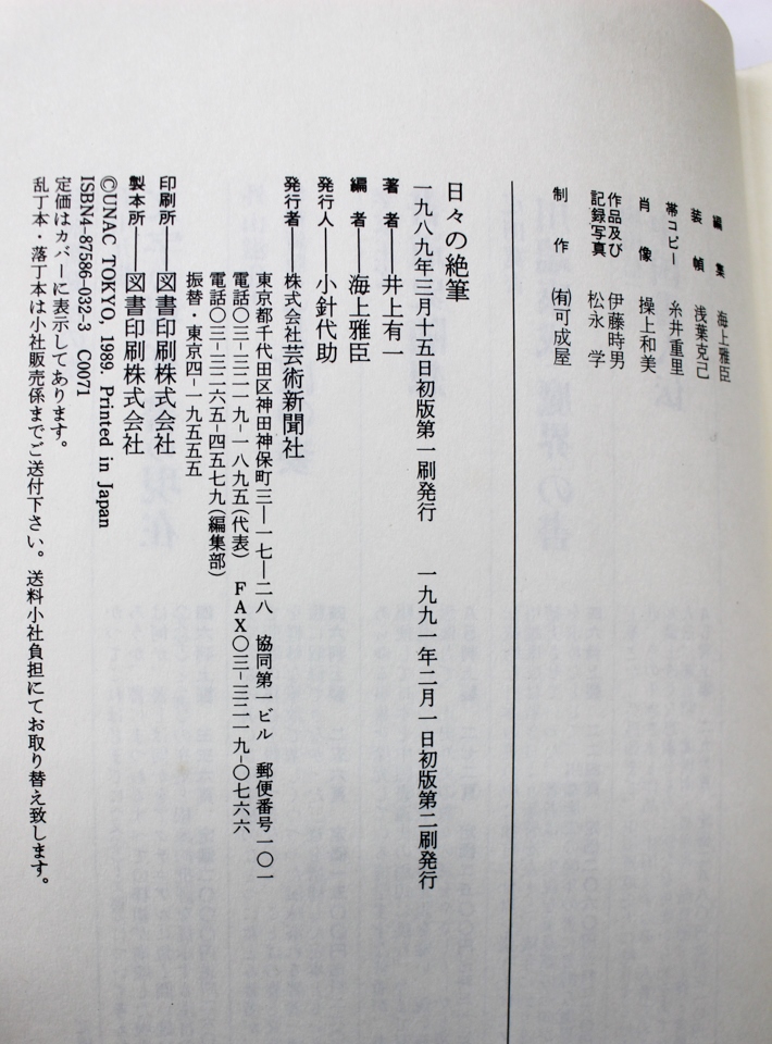 本の紹介 Published on 2018年2月16日 『日々の絶筆』井上有一全文集 2018/02/16 written by 悠久堂書店 昭和の書家の中でも特別人気のある井上有一 彼の創作にかける率直な思いを綴った文集 今日より明日、上手く書ける補償がないから毎日絶筆の思いで書き続ける 書道の可能性を追求してもがき苦しむ姿が見る人に感動を与えるのかもしれません 関連ページ
