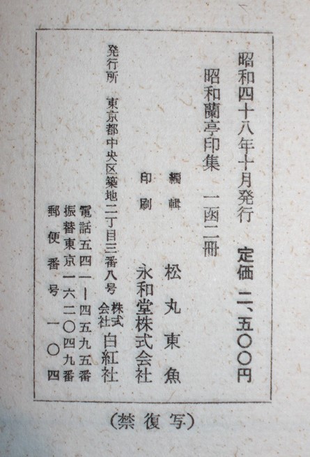 本の紹介 Published on 2018年6月7日 『昭和蘭亭印集』白紅社 2018/06/07 written by 悠久堂書店 昭和48年癸丑の年を記念して松丸東魚のもと集まった62人の篆刻家による印集 62人で王羲之蘭亭序全文をそれぞれが印にしています 4文字から9文字まで個性豊かな印影が並んでいる楽しい1冊です 『昭和蘭亭印集』1函2冊 松丸東魚編 白紅社 昭和42年 関連ページ