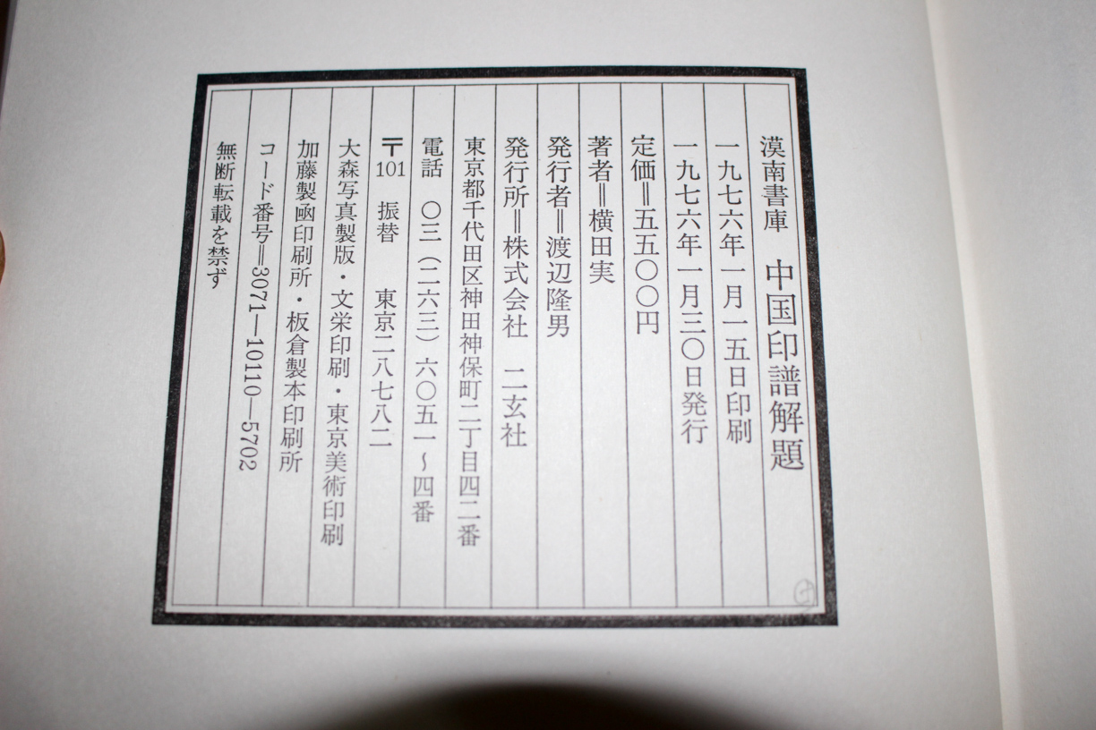 今日の1冊, 本の紹介 Published on 2018年9月4日 『漠南書庫 中国印譜解題』二玄社 2018/09/04 written by 悠久堂書店 戦前戦中と中国で過ごした著者が戦後蒐集した印譜、 一千点を超える膨大なコレクションを解読し、 著者没後その原稿を篆刻家 小林斗盦が整理編輯し完成した1冊 『中国印譜解題』横田実著 二玄社 1976年 関連ページ