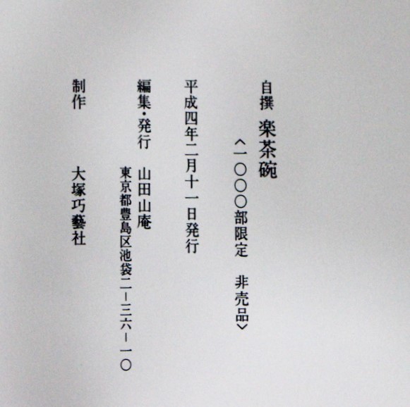 本の紹介 Published on 2018年8月17日 『自撰 楽茶碗』山田山庵 2018/08/17 written by 悠久堂書店 1906年生まれの陶芸家 山田山庵の作品集 他界する3年前に発行された千部限定の自撰集 関連ページ