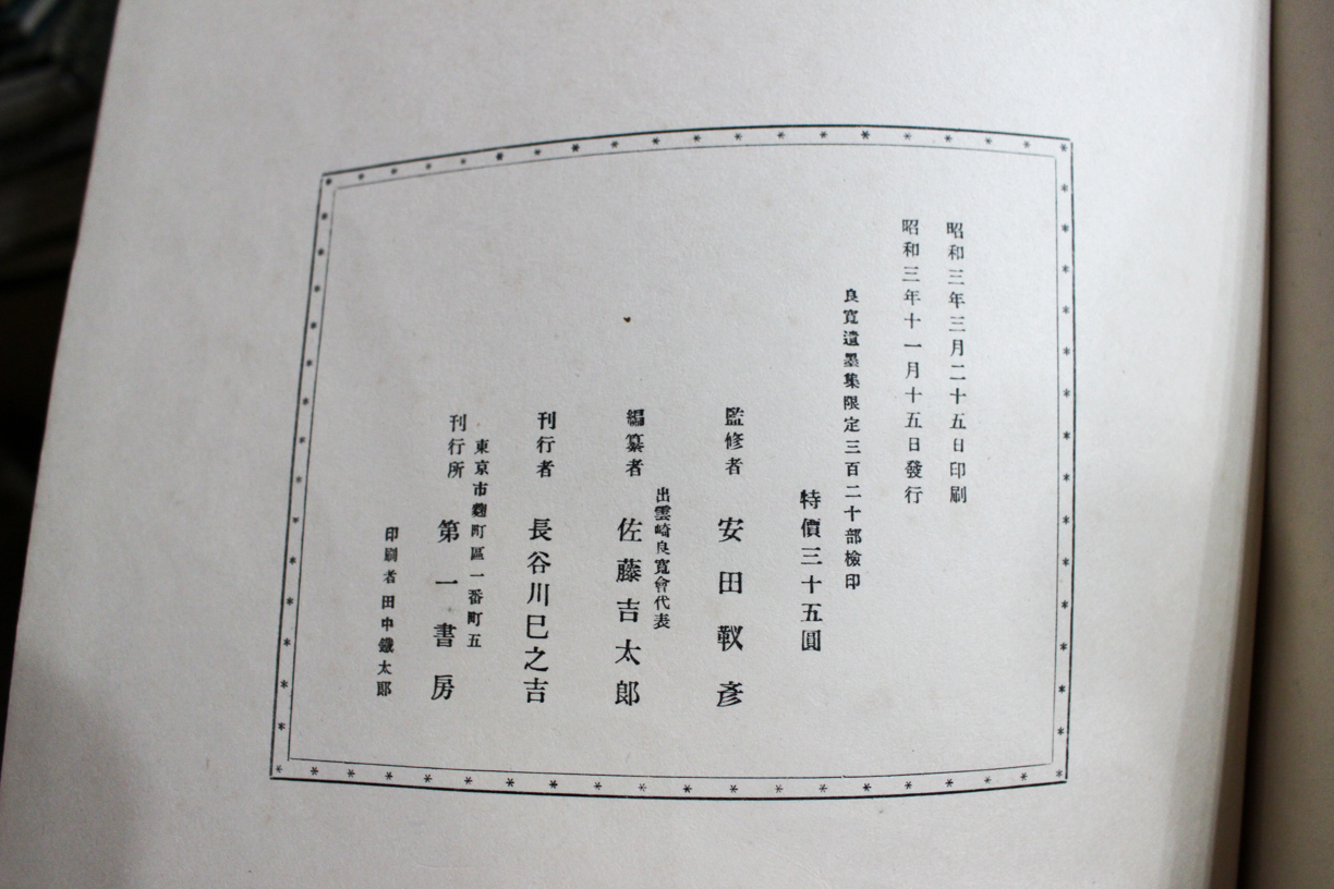 本の紹介 Published on 2018年5月23日 『良寛遺墨集』第一書房 2018/05/23 written by 悠久堂書店 常に人気のある良寛の書ですが 確かに一、二、三、い、ろ、は、 どの文字にも趣があって素敵です 『良寛遺墨集』安田靫彦監修 昭和3年 第一書房 関連ページ