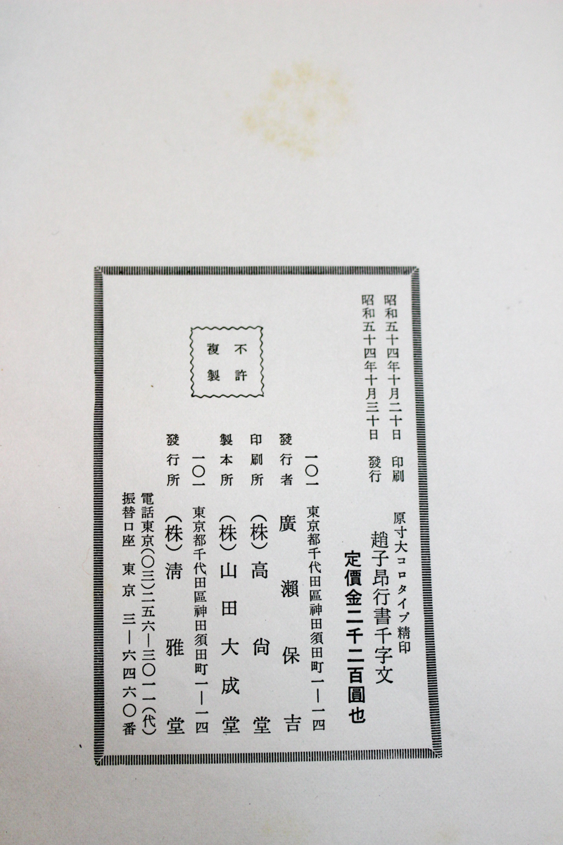 本の紹介 Published on 2017年1月19日 『趙子昴行書千文』清雅堂 2017/01/19 written by 悠久堂書店 たびたび千字文をご紹介していますが 今日は『趙子昴行書千文』です。 趙子昴は中国、元代の文人ですが、生涯千百篇の千字文を書いたと いわれています。 東晋の王羲之・王献之親子を手本に古典を学んだ 趙子昴の晩年期の傑作ですので、 これから千字文を勉強しようという方にはおすすめです。 和綴じ、原寸大コロタイプで細部まで見やすくなっています 『趙子昴行書千文』清雅堂 関連ページ