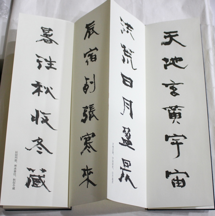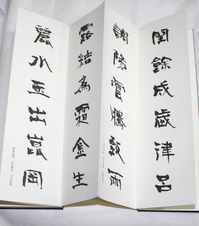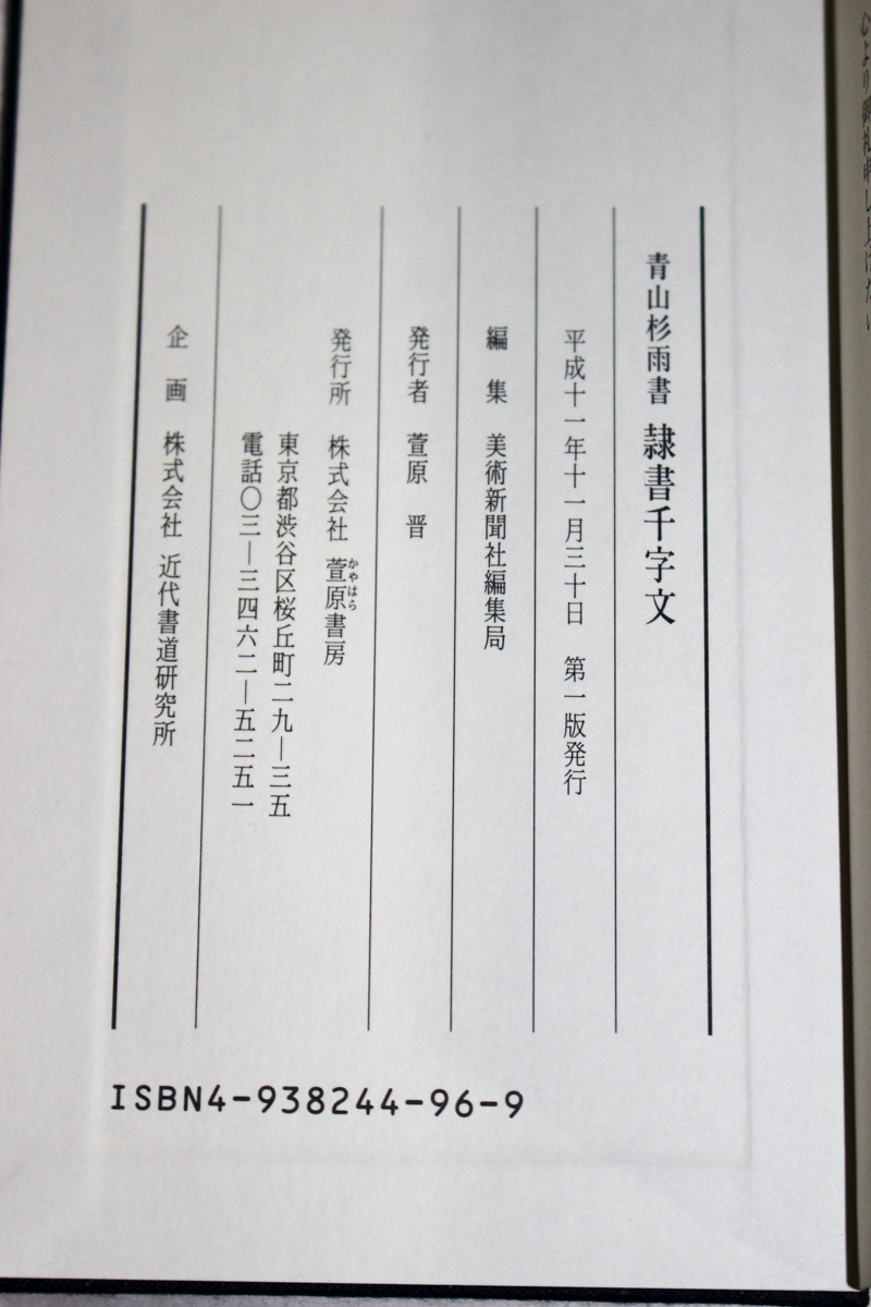 本の紹介 Published on 2017年3月9日 『青山杉雨書 隷書千字文』美術新聞社編集局 2017/03/09 written by 悠久堂書店 解説いわく青山杉雨先生が生前唯一残された完全な形の千字文だそうです。 一行6文字で鑑賞にも練習にも使いやすい帖仕立ての本、2冊です。 もとの紙のサイズは天地寸法60cmだったとか。 そのサイズのものも見てみたいものです (ちなみにこの本は天地29.6cmです) 関連ページ