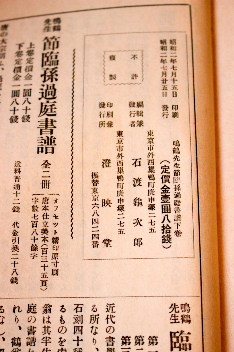 本の紹介 Published on 2018年5月13日 『鳴鶴翁臨書譜』日下部鳴鶴 2018/05/12 written by 悠久堂書店 明治の三筆の一人、日下部鳴鶴の晩年の草書手本として 貴重な孫過庭の書譜を臨書したもの。 細部より全体が持つ書譜のイメージが伝わってくる良い臨書手本です 関連ページ