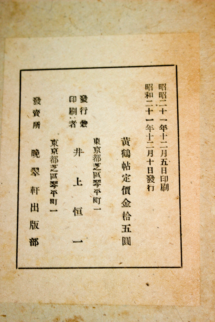 本の紹介 Published on 2018年7月5日 『黄鶴帖』 鈴木翠軒 2018/07/05 written by 悠久堂書店 昭和21年に晩翠軒から発行された縦26センチの法帖 鈴木翠軒らしい淡墨の楷書作品で文字数が見開き6文字と 半紙の学習にぴったりです。 こちらの本は古書総合サイト「日本の古本屋」で販売中です 購入はこちら 当店の一部在庫、通信販売でお買い求めいただけます。一覧に無い本はお問い合わせください。 関連ページ