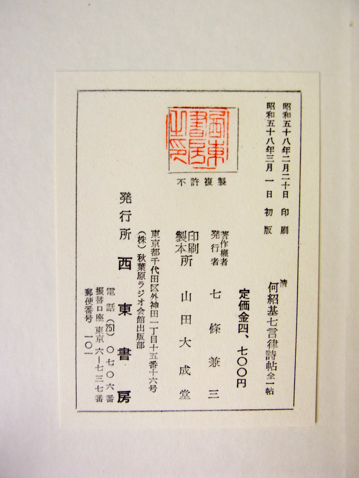 今日の1冊, 本の紹介 Published on 2019年6月26日 中国書道/何紹基七言律詩帖 2019/06/26 written by 悠久堂書店 タイトル:何紹基七言律詩帖 発行所:西東書房 発行年:昭和58年 一文字のサイズが8から9cmくらいで条幅学習に最適です 関連ページ