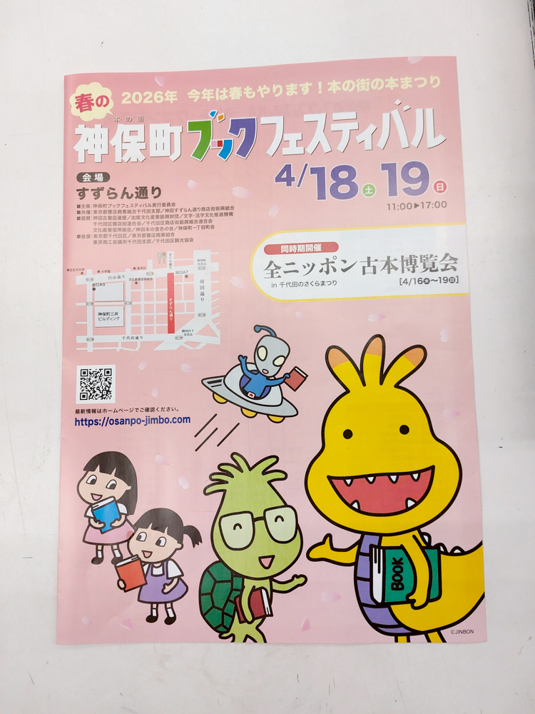 お知らせ Published on 2026年4月10日 全ニッポン古本博覧会と同時!!神保町ブックフェスティバルが4月18日・19日の2日間開催 written by 悠久堂書店 毎年秋恒例の神保町ブックフェスティバルが4月18日(土)、19日(日)限定で神保町で開催されます。去年の古本まつり期間は雨のため中止になってしまったので春に開催されるなんてファンの方には激アツな事態です。この機会を絶対に逃さないよう、しっかり朝から気になる出版社さんをチェックしましょう。神保町ブックフェスティバルのフライヤーはすずらん通りのお店を中心に配布中です♪ 関連ページ