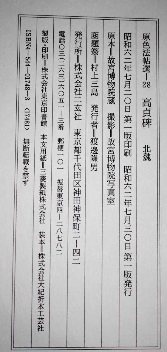 本の紹介 Published on 2018年7月12日 原色法帖選『北魏 高貞碑』二玄社 2018/07/12 written by 悠久堂書店 二玄社の原色法帖選では故宮博物院蔵の沈樹鏞旧蔵の出土初拓『高貞碑』が 使用されています。 ほかのものに比べて鋭い線と浮き上がってくるような白の部分が印象的です。 二玄社の書跡名品叢刊ではほかの底本が使われているようなので 比べてみるのも良さそうです。 関連ページ