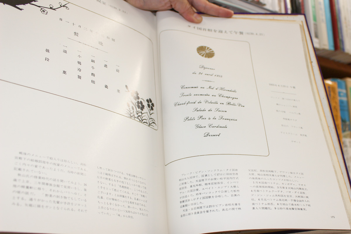 本の紹介 Published on 2016年8月20日 天皇家の饗宴など written by 悠久堂書店 ドラマ 『グ・ラ・メ!~総理の料理番~』は総理大臣の来賓用の料理のお話しですが 今日ご紹介するのは『天皇家の饗宴』『天皇家午晩餐会の御献立』の2冊です。 首相以上に天皇陛下の召し上がっているものが気になりますよね。 国賓の方々やゲストをお迎えされる時に召し上がったメニューがたくさん出ています。 戦前から戦後まで、シンプルに物の名前のみ書かれたメニューもあれば 詳しく材料まで書いてある場合もあるので思いのほか統一感がなくて面白いです。 関連ページ