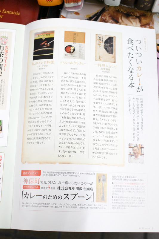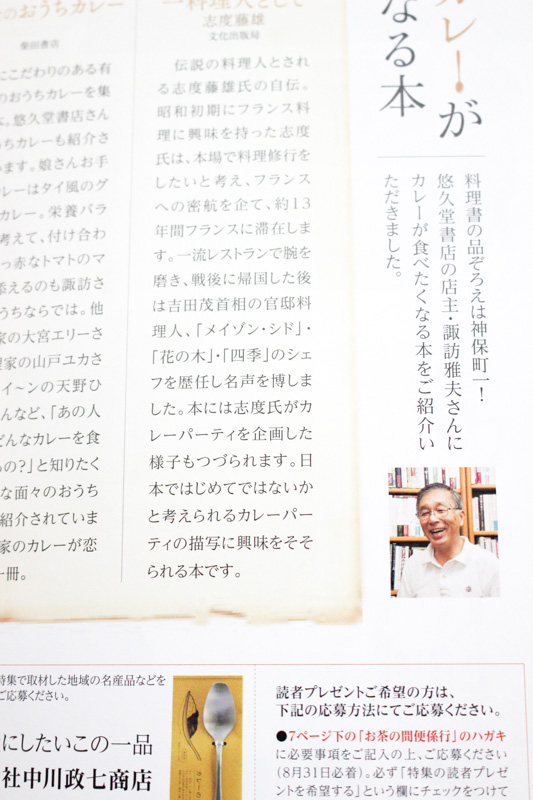 メディア掲載, 本の紹介 Published on 2016年8月3日 日清医療食品(株)の『美し国』に掲載されました written by 悠久堂書店 神保町カレー特集ということで日清医療食品(株)の『美し国』に カレーを食べたくなる本3冊をご紹介させていただきました。 おススメの3冊はこちらです! 『私のインド料理』柴田書店 『みんなのおうちカレー』柴田書店 『一料理人として』文化出版局 辛いカレーで夏の暑さを乗り切りましょう 関連ページ