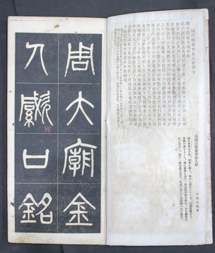 今日の1冊, 本の紹介 Published on 2018年10月1日 楊沂孫篆書金人銘 2018/10/01 written by 悠久堂書店 清の学者、楊沂孫の篆書作品 清代のほかの書家と比べても伸びやかで独特な味わいがあります。 1文字のサイズは縦7センチ、横6センチと少し縦長です。 関連ページ