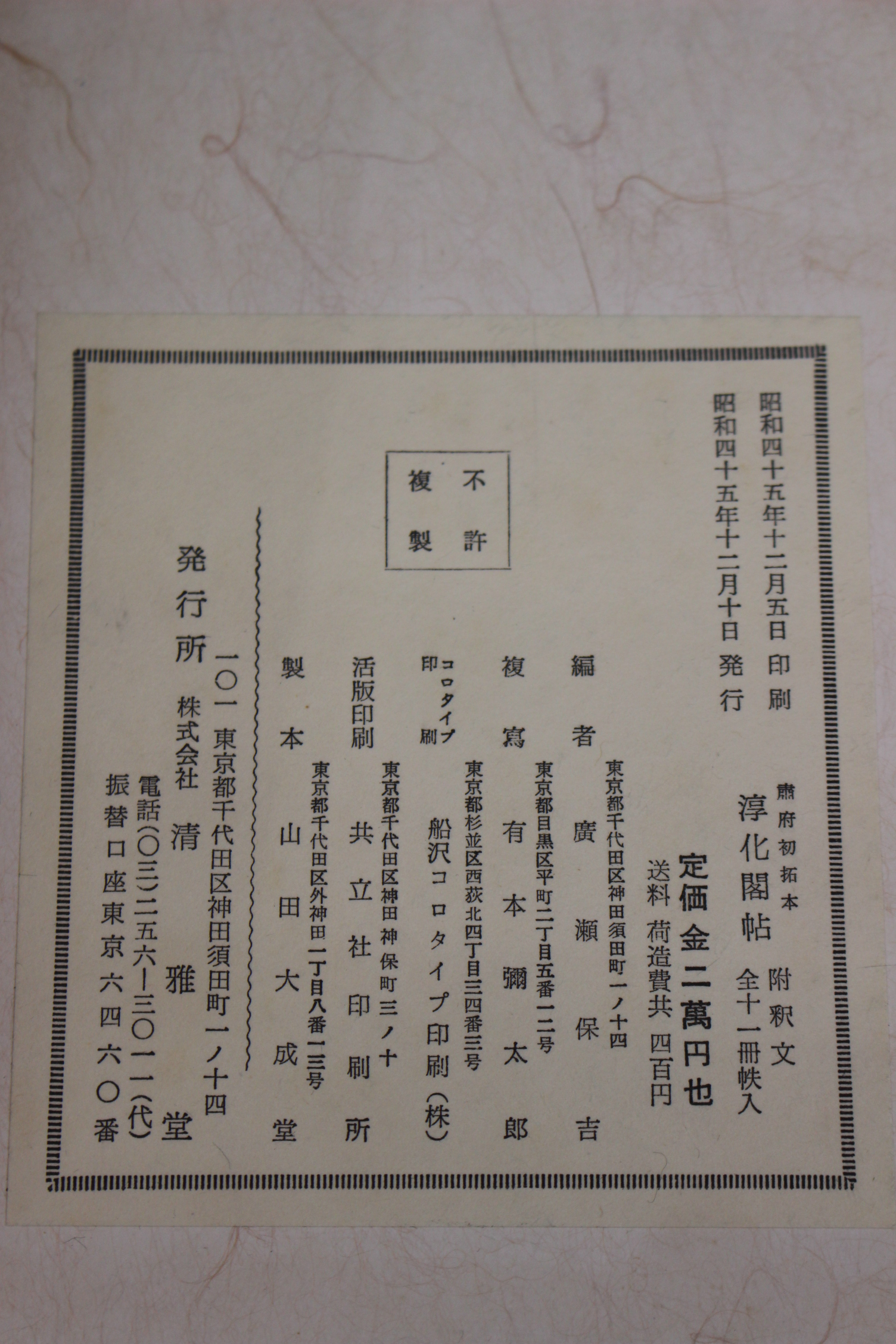 新着入荷, 本の紹介 Published on 2016年5月16日 清雅堂 淳化閣帖 初拓粛府本 written by 悠久堂書店 太宗皇帝の勅命により作られた「淳化閣帖」ですが、 元版はのちに焼失しその後多くの復刻がなされました。 清雅堂出版の「淳化閣帖 初拓粛府本」は明時代に作成されたもののひとつで 原本に近いと評される逸品です。 1帙全11冊( 33cm)の 和装本でお手本として手元に置かれるのに 丁度いいサイズです! 関連ページ