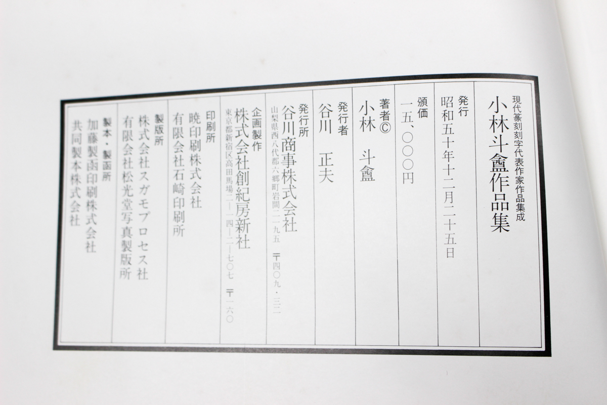 未分類 Published on 2017年2月21日 篆刻『小林斗盦作品集』谷川商事株式会社 2017/2/21 written by 悠久堂書店 昨年末に東京国立博物館で生誕百年記念の展覧会の行われた篆刻家 小林斗盦の作品集 保田幸三・松丸東魚などと一緒に「現代篆刻刻字代表作家作品集成」として作られたうちの1冊。 巻頭には斗盦蒐集の中国書作品や篆刻作品が掲載されている 関連ページ