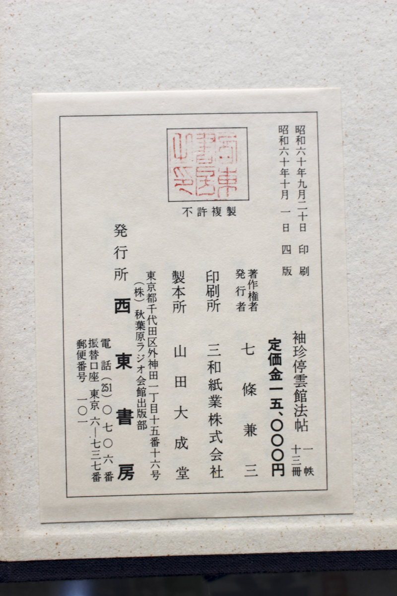 今日の1冊, 本の紹介 Published on 2019年12月4日 中国書道/袖珍停雲館法帖 written by 悠久堂書店 袖の中にすっぽり入るから袖珍本とはいい名前ですよね。 こちらの停雲館法帖もすっぽり袖に入る小さな本です。 実用的とは決して言えませんが、可愛いのでつい飾りたくなります。 タイトル:袖珍停雲館法帖 1帙13冊 発行所:西東書房 発行年:昭和60年 2019/12/04 関連ページ