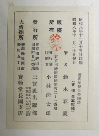 本の紹介 Published on 2018年5月16日 鈴木翠軒手本3種 「翠軒新書鑑」「楷書早発白帝城詩」 written by 悠久堂書店 鈴木翠軒の楷書手本としての「前赤壁賦鈔」と「早発白帝城詩」「翠軒新書鑑 上級編」には草書、かな、実用書、古典臨書の手本が多数載っています 「翠軒新書鑑」は古書総合サイト「日本の古本屋」で販売中です 購入はこちら 当店の一部在庫、通信販売でお買い求めいただけます。一覧に無い本はお問い合わせください。 関連ページ
