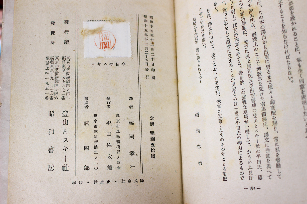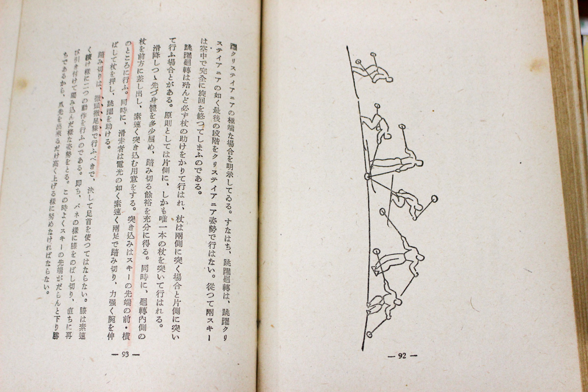 本の紹介 Published on 2016年9月6日 『今日のスキー』残暑に雪山を想う written by 悠久堂書店 9月に入ってから急に残暑が厳しくなってきましたね 暑い日に雪山に思いを馳せてスキーの本のご紹介です 昭和15年に発行された『今日のスキー』には イラスト入りでわかりやすく本格的な滑り方の解説があり 重要なところに朱線が引かれているのも実用書として使われていた本の歴史を感じます ★『今日のスキー』★ 訳者:福岡孝行 発行:登山とスキー社 発行年:昭和15年 関連ページ